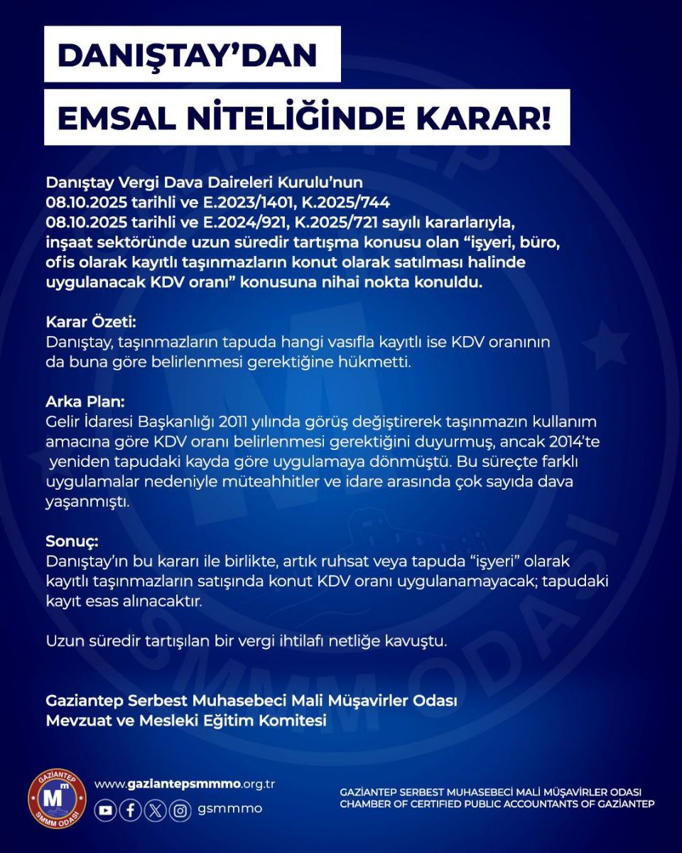 Danıştay VDDK’nın 08.10.2025 tarihli ve E.2023/1401, K.2025/744 sayılı, 08.10.2025 tarihli ve E.2024/921, K.2025/721 sayılı Kararları ile inşaat sektöründe yıllardır süregelen ruhsat veya tapularında işyeri, büro, ofis olarak geçen fakat konut olarak kullanılmak üzere satılan taşınmazların tesliminde uygulanacak KDV oranı ile ilgili kafa karışıklığına son noktayı koydu. GİB'in 2011 yılına kadar bu satışları tapudaki kayıtlara göre değerlendirip işyeri, büro olarak gördüğü uygulamayı 2011 yılında görüş değiştirerek ne amaçla kullanılacağına göre KDV uygulanması gerektiğine dair özelgeler, sirküler yayınlamış olsa da bu kararından 2014 yılında vazgeçerek eski uygulamaya dönmesi üzerine 2011-2014 yıllarında konut KDV'si uygulanarak düzenlenen faturalar ve bu teslimlere ilişkin müteahhitler tarafından alınan KDV iadelerini de cezalı olarak geri istemesi onlarca mükellefle idare arasında davalık durumlar oluşturdu.